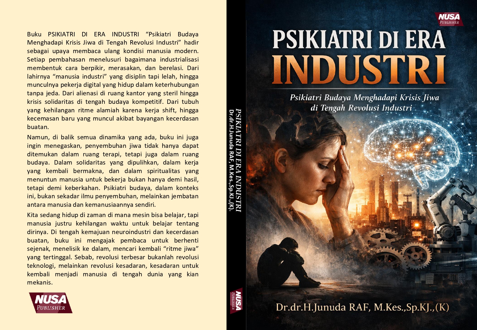 Buku PSIKIATRI DI ERA INDUSTRI “Psikiatri Budaya Menghadapi Krisis Jiwa di Tengah Revolusi Industri” hadir sebagai upaya membaca ulang kondisi manusia modern. Setiap pembahasan menelusuri bagaimana industrialisasi membentuk cara berpikir, merasakan, dan berelasi. Dari lahirnya “manusia industri” yang disiplin tapi lelah, hingga munculnya pekerja digital yang hidup dalam keterhubungan tanpa jeda. Dari alienasi di ruang kantor yang steril hingga krisis solidaritas di tengah budaya kompetitif. Dari tubuh yang kehilangan ritme alamiah karena kerja shift, hingga kecemasan baru yang muncul akibat bayangan kecerdasan buatan. Namun, di balik semua dinamika yang ada, buku ini juga ingin menegaskan, penyembuhan jiwa tidak hanya dapat ditemukan dalam ruang terapi, tetapi juga dalam ruang budaya. Dalam solidaritas yang dipulihkan, dalam kerja yang kembali bermakna, dan dalam spiritualitas yang menuntun manusia untuk bekerja bukan hanya demi hasil, tetapi demi keberkahan. Psikiatri budaya, dalam konteks ini, bukan sekadar ilmu penyembuhan, melainkan jembatan antara manusia dan kemanusiaannya sendiri. Kita sedang hidup di zaman di mana mesin bisa belajar, tapi manusia justru kehilangan waktu untuk belajar tentang dirinya. Di tengah kemajuan neuroindustri dan kecerdasan buatan, buku ini mengajak pembaca untuk berhenti sejenak, menelisik ke dalam, mencari kembali “ritme jiwa” yang tertinggal. Sebab, revolusi terbesar bukanlah revolusi teknologi, melainkan revolusi kesadaran, kesadaran untuk kembali menjadi manusia di tengah dunia yang kian mekanis.