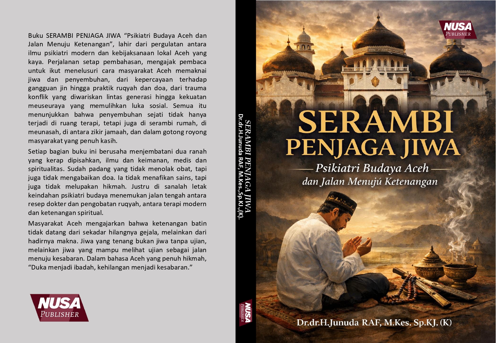 Buku SERAMBI PENJAGA JIWA “Psikiatri Budaya Aceh dan Jalan Menuju Ketenangan”, lahir dari pergulatan antara ilmu psikiatri modern dan kebijaksanaan lokal Aceh yang kaya. Perjalanan setap pembahasan, mengajak pembaca untuk ikut menelusuri cara masyarakat Aceh memaknai jiwa dan penyembuhan, dari kepercayaan terhadap gangguan jin hingga praktik ruqyah dan doa, dari trauma konflik yang diwariskan lintas generasi hingga kekuatan meuseuraya yang memulihkan luka sosial. Semua itu menunjukkan bahwa penyembuhan sejati tidak hanya terjadi di ruang terapi, tetapi juga di serambi rumah, di meunasah, di antara zikir jamaah, dan dalam gotong royong masyarakat yang penuh kasih. Setiap bagian buku ini berusaha menjembatani dua ranah yang kerap dipisahkan, ilmu dan keimanan, medis dan spiritualitas. Sudah padang yang tidak menolak obat, tapi juga tidak mengabaikan doa. la tidak menafikan sains, tapi juga tidak melupakan hikmah. Justru di sanalah letak keindahan psikiatri budaya menemukan jalan tengah antara resep dokter dan pengobatan ruqyah, antara terapi modern dan ketenangan spiritual. Masyarakat Aceh mengajarkan bahwa ketenangan batin tidak datang dari sekadar hilangnya gejala, melainkan dari hadirnya makna. Jiwa yang tenang bukan jiwa tanpa ujian, melainkan jiwa yang mampu melihat ujian sebagai jalan menuju kesabaran. Dalam bahasa Aceh yang penuh hikmah, “Duka menjadi ibadah, kehilangan menjadi kesabaran.”